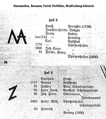 Hof (house/farm) 5: 1776 – the probable owner was Jurgen Anton Friederich Thiessenhusen. In 1803, his son Johann Cuno Thiessenhusen inherited the house. In 1831, after Johann Cuno died (asthma), his oldest son Friederich Franz inherited it. The house was still in the Thiessenhusen family when this Hausmarken book was published in 1900. Descendents of Friederich Franz Thiessenhusen continue to live in Rosenow today.