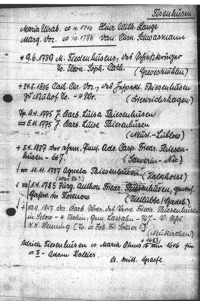 Kartei-Auszüge aus Mecklenburgischen Kirchenbüchern Extract File of Mecklenburg Church Registers Der Auszug aus den Mecklenburgischen Kirchenbüchern ist ein weiterer Beweis aus den 40er Jahren für die Ahnenforschung. Sie enthalten Informationen über unsere Vorfahren. Dort ist die Rede von hunderten Familien, die als Bauern, Schäfer, Müller und Wandergesellen tätig waren. Diverse Thies(s)enhusen-Vorfahren werden auf 16 Seiten erwähnt.
