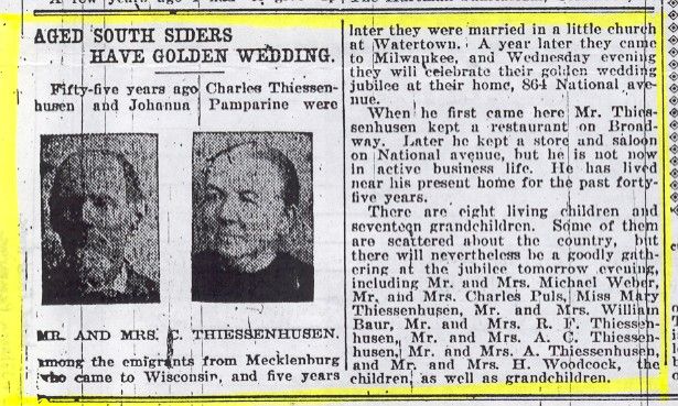 Dieser Artikel sagt aus, dass Carl Thiessenhusen ein Restaurant hatte, nachdem er nach Milwaukee kam. Hier zeigt sich, dass eine Familientradition in beruflicher Hinsicht fortsetzte. Später führte er ein Geschäft (vermutlich eine Schneiderei) und einen Saal in der National Avenue. Carl und Johanna lwohnten dort in der Hausnummer 864 nach 1860.