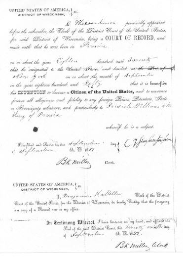 ... emigrated with his brother Heinrich in 1850. Settled in Milwaukee, Wisconsin. Carl, b. 1820 and Johanna, b. 1833 (Pamperien) Thiessenhusen had twelve children: Theodore, b. April 1854; Wilhelmine, b. June 1855; Ida, b. March 1857; Alvina, b. November 1858; Mary, b. June 1861; Albertina, b. April 1863; Rheinhold, b. November 1865; August, b. October 1866; Edward, b. December 1869; Albert, b. May 1872; Frank, b. September 1874; and Clara, b. July 1876. Carl and Johanna’s family lived in the city of Milwaukee. Carl was a tailor. Note: Most of the descendants Carl, Heinrich, and Christoph kept the traditional Mecklenburg spelling of their family name: “Thiessenhusen.” The descendants of Wilhelm and Joachim changed the spelling of their name to “Thiesenhusen.” Two families shortened their name to “Thiesen.” |