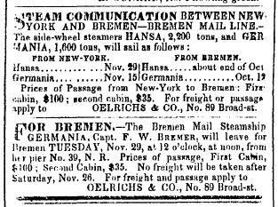 “Marine Intelligence,” 17 November 1853, “Arrived. Steamship Hansa, Geerken [captain], Bremen, October 29 [departure], with merchandise and 350 passengers to Oelrichs & Co. [broker], Arrived off Sandy Hook [in New York Harbor] at 1 o’clock this morning. Has had heavy westerly gales and heavy weather on the passage, except the last three days.” |