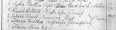 The sponsors at Johann Wilhelm’s baptism were: 1.) Heinrich Wilhelm Thiessenhusen, 2.) Johann Heinrich Stammann, and 3.) Catharina Dorothea Thiessenhusen all of Rosenow. |