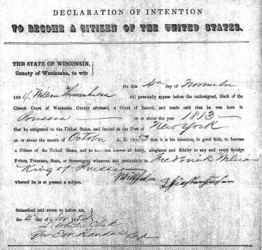 Wilhelm Thiessenhusen completed a Letter of Intent, the first step to become a naturalized citizen, on 4 November 1854 in Waukesha County, Wisconsin. Notice his signature. Wilhelm and Elisabeth had five children; three lived to adulthood. Marie Thiessenhusen was born in Dragun near Vietlübbe in 1845. She married George Wollmer in Greenfield, Wisconsin in 1865. William Thiessenhusen was born in Rosenow in 1852. He married Ricka Garbe. Charles “Charlie” Thiessenhusen was born in New Berlin, Wisconsin in 1857. He did not marry. |
