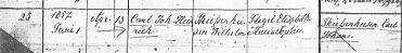 Baptism of Carl “Charlie” Thiesenhusen New Berlin, Wisconsin, 1857 | [baptism #] 25) | 1 June 1857 | [birthdate] 13 April | [child] Carl Johann Heinrich “Charlie” Thiesenhusen | [father] Wilhelm Thiessenhusen | [mother] Elisabeth Marie Sophie née Flägel | [sponsor] Carl Johann Thiessenhusen – (Wilhelm’s brother from Milwaukee was Charlie’s namesake and sponsor.) Charlie Thiessenhusen was Wilhelm and Elisabeth’s youngest child; their only child born in America. This record is from the New Berlin E&R Church on Racine Avenue, Waukesha County, Wisconsin. The format is identical to the early church records in Mecklenburg, Germany. |
