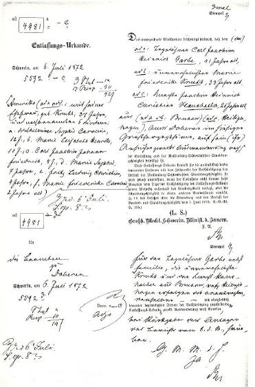 A permit to emigrate was needed to go to North America. This document was prepared by the Mecklenburg-Schwerin Ministry of the Interior on 6 July 1872 in Doberan. It names all members of the Carl Joachim Heinrich Garbe family, and two other individuals, in three groups. They planned to leave on 1 August 1872. Maria Elisabeth Henricka “Ricka” Garbe, born 22 January 1862, is listed as the second person in group “a.” She became William Thiesenhusen’s wife. Marie Kruth in group “b” is Anna Kruth Garbe’s sister, future wife of Carl Garbe’s brother Johann Joachim Heinrich Garbe. |